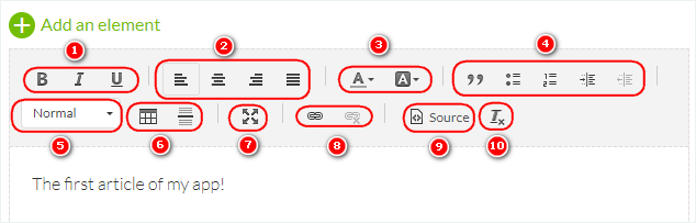9. Icono Source en la barra de herramienta te deja entrar código HTML que será leído por tu app. El párrafo entero será en formato HTML