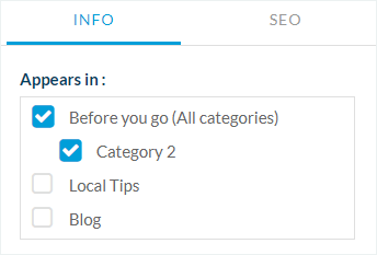 En este ejemplo, el articulo se visualizará en la sección Before you go (All Categories) y también en la categoría 2.