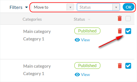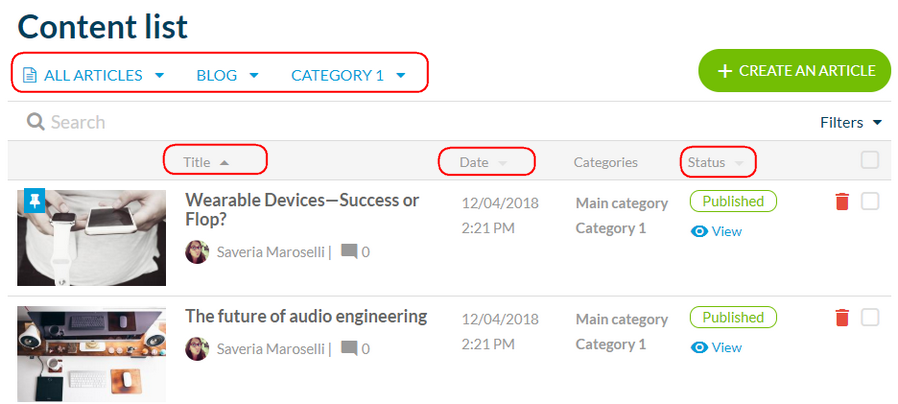 - Filtros: muestra el contenido dependiendo sobre el estatus de publicación y/o autor.