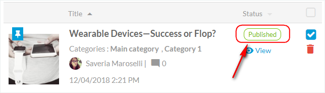 - No publicado: Tu contenido se guardará pero no será visible a tus usuarios. Este estatus puede ser util para informar los miembros de tu equipo que un articulo se necesita revisar antes de publicar.