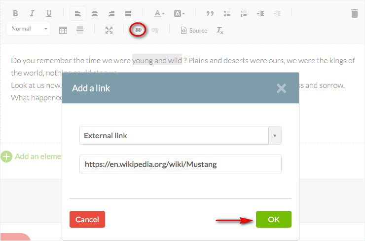 2. Haz clic el icono de enlace en la barra de herramientas del párrafo.