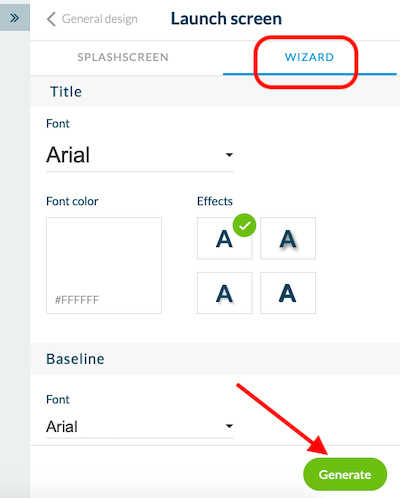 - Configura la fuente, color, y efectos de tu titulo y baseline (en el ejemplo de arriba, el titulo es Welcome, y el baseline es Loading your app now)