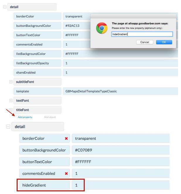9 - Añade el valor 1 a la propiedad hideGradient, debajo del objeto "detail"