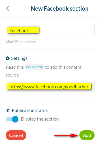 3 - Añade una sección de Facebook escogiendo "Facebook" en los items del contenido