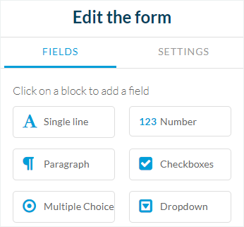 - Campos que permiten a los usuarios rellenar directamente la información (por ejemplo: "Única línea", "Párrafo de texto", "Nombre", "Email", etc.)