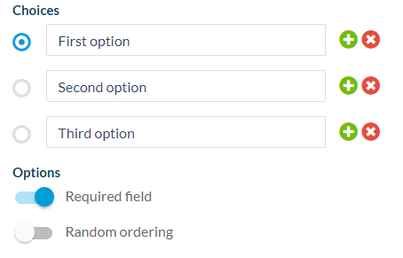 En los campos en los que puedes crear una lista de opciones ("Múltiple opción", "Desplegable" o "Casillas"), puedes añadir o eliminar opciones ( al hacer clic en "+" o "x".)