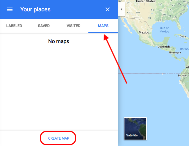 Haz clic en la pestaña Mapas y luego sobre "Crear un mapa" en la parte inferior de la página.