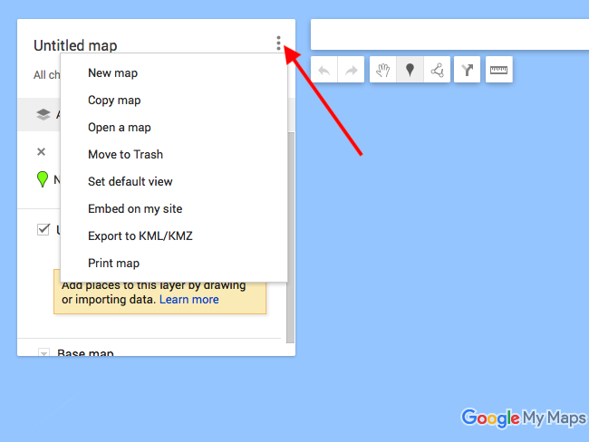 Una vez que tus puntos han sido creados, exporta el archivo KML. Haz clic en el icono cerca del título y selecciona la opción "Exportar KML/KMZ".