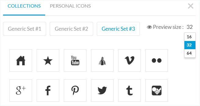 Diferentes conjuntos de iconos están disponible desde las pestañas de nuestra colección: