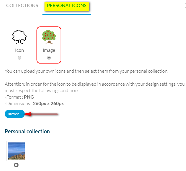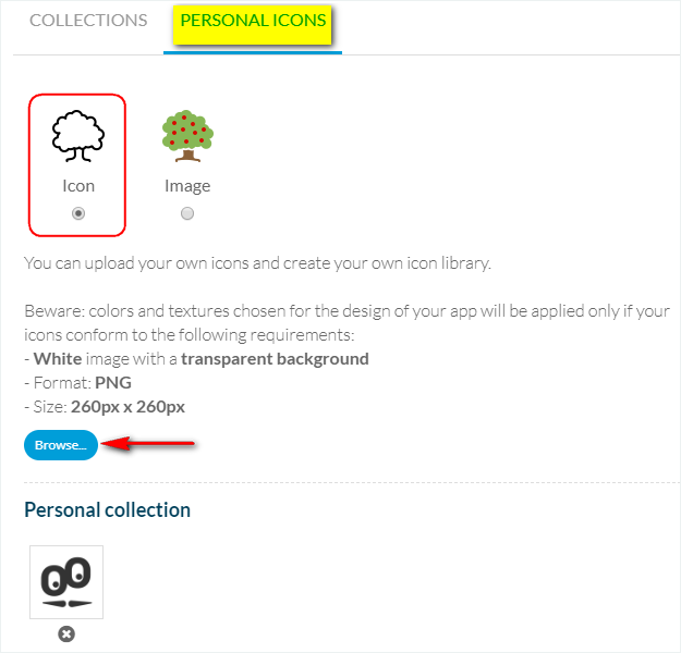 La lista de iconos que haz subido se mostrará a continuación, en el área de colección Personal.