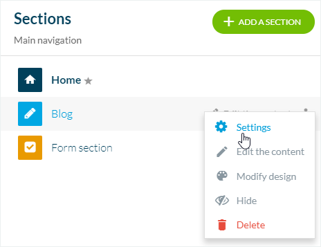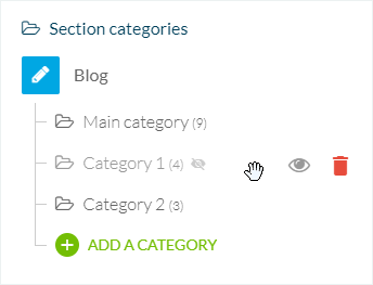 1 - Desde la pagina de ajustes de tu sección, haz clic en el icono del ojo para publicar o no publicar tus categorías.