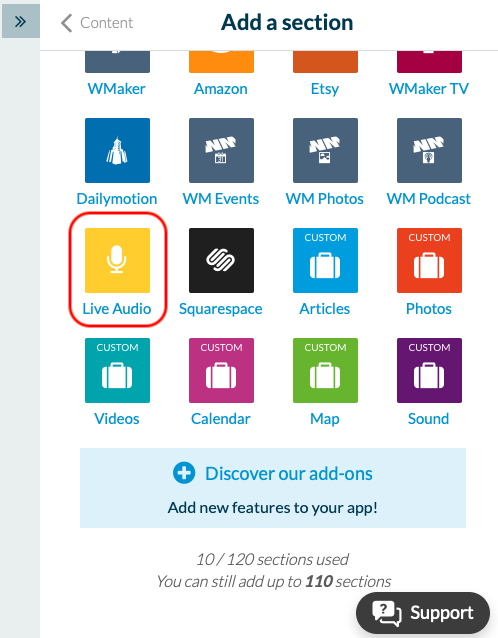 Serás re-dirigido a la pestaña Secciones y una sección será creada automáticamente. Si no, puedes ir al Mi app > Contenido > Secciones > Añadir una pagina. Un menú desplegable aparecerá y podrás hacer clic en cargar mas para mostrar la lista de secciones y escoge la opción Live Audio