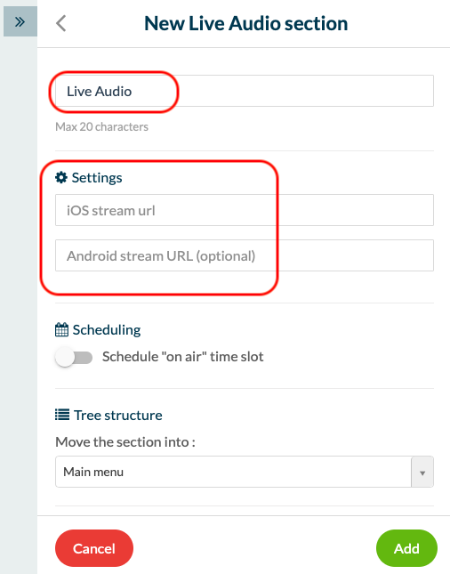 Nombra tu sección y añade el URL de tu fuente codificado de acuerdo a las especificaciones de iOS, este flujo se emitirá por defecto.